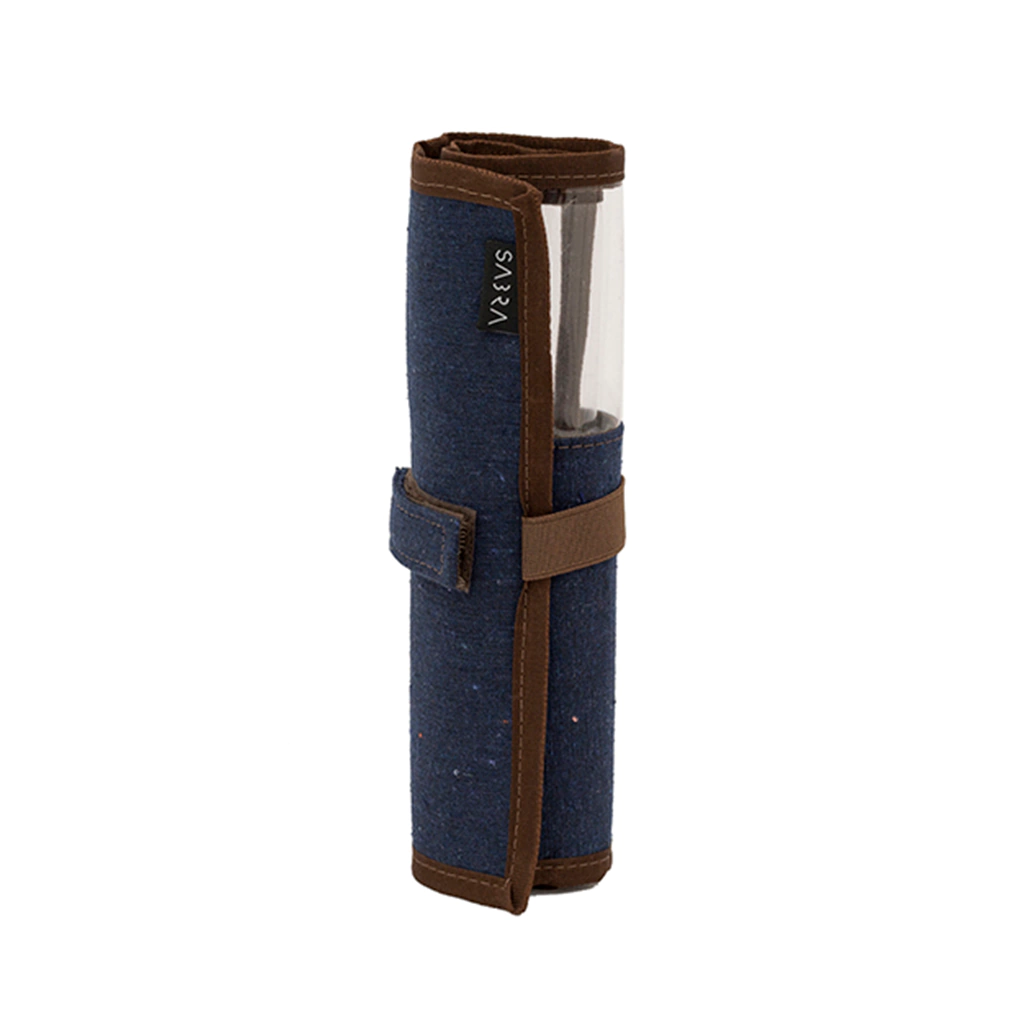 Confeccionado em lona reciclada 420g, o estojo é resistente e sustentável. O fechamento com elástico e velcro proporciona segurança e praticidade, permitindo que o estojo seja enrolado e guardado facilmente.