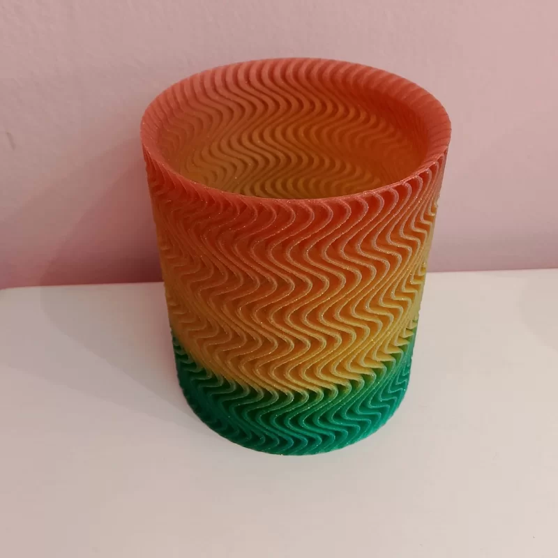 Dê um toque criativo e vibrante ao seu cantinho com este porta-lápis impresso em 3D com um degradê incrível em tons de vermelho, laranja, amarelo e verde! Seu design em ondas dá um charme especial à peça, além de oferecer um visual moderno e divertido. Perfeito para organizar seus itens de papelaria com estilo.