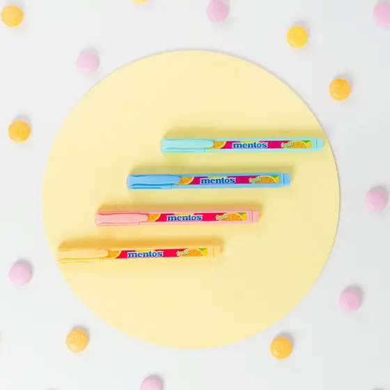 Falando em traços, o Marca-texto Mentos veio para iluminar seus dias com cores intensas e um aroma delicioso. Com uma ponta chanfrada que desliza suavemente sobre o papel, ele destaca informações importantes com estilo. O design anatômico em formato “D” é inovador e ergonômico, proporcionando uma experiência única de uso. E com o toque especial de Mentos, suas anotações ganharão um charme extra.