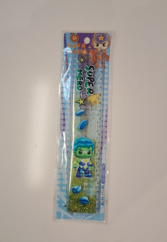 Dê um toque de ação ao material escolar dos seus filhos com a Régua Super Hero de 20 cm, recheada de água e glitter que se movem conforme a régua é utilizada.