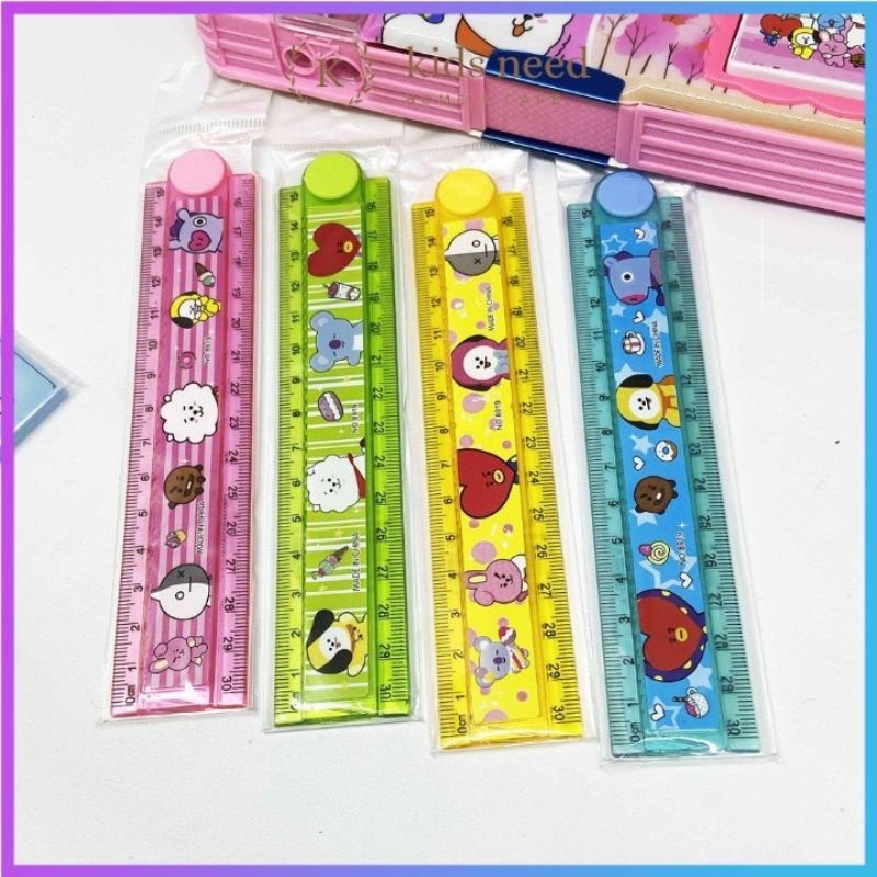 Aberta a régua fica com 30 cm e conta com 10 formas geométricas diferentes em seu extensor..
