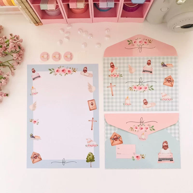 - Cada kit contém 4 envelopes, 4 papéis de carta  e 4 adesivos para fechamento.