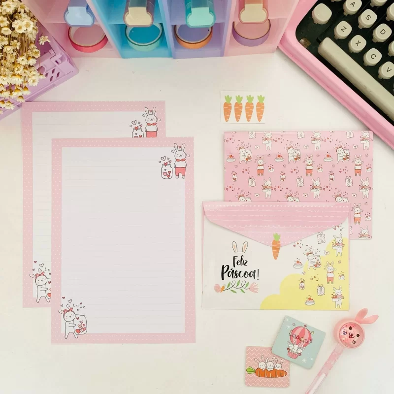 - Cada kit contém 4 envelopes, 4 papéis de carta e 4 adesivos para fechamento.