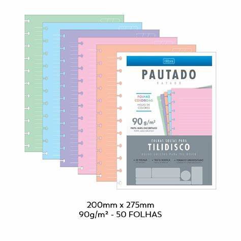 O Caderno Universitário Folhas Soltas Tilidisco Colorido possui 50 folhas com pauta branca de gramatura 90 g/m² e formato colegial, com dimensões 17.7 x 24cm.