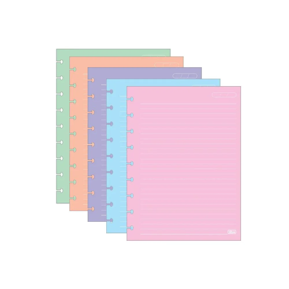 O Refil para Tilidisco Universitário Folhas Coloridas Pauta Branca 50 Folhas tem gramatura de 90 g/m² para facilitar o encaixe dos discos e oferecer mais possibilidades de escrita com diversos tipos de canetas. O produto possui furação para 11 discos.