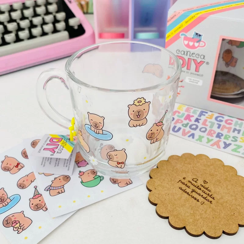 As canecas DIY – “Decorate it yourself” são perfeitas para quem gosta de produtos personalizados e únicos! Elas acompanham adesivos fantásticos que podem ser lavados e não rasgam! São muitas opções de adesivo e letrinhas você se divertir!