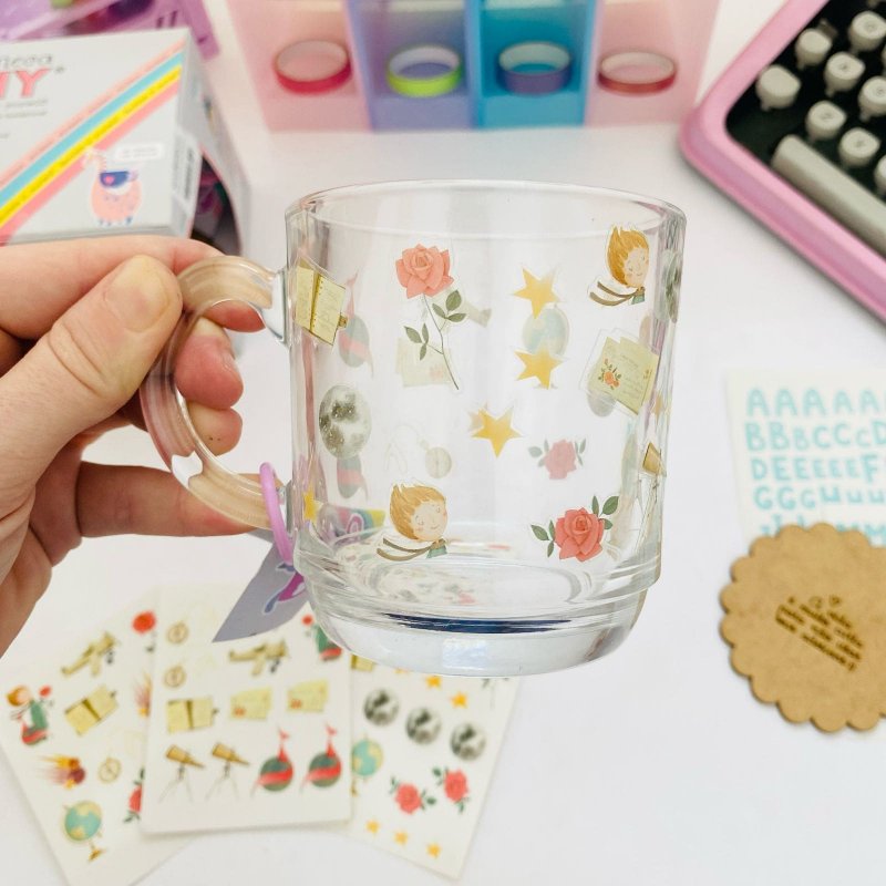 -1 Caneca de vidro lisa, 350 ML -3 Cartelas de adesivos resistentes à água com desenhos temáticos -2 Cartelas com letrinha para personalizar nome e frases -1 Suporte em MDF com a frase: “A vida é muito curta para guardar adesivos”.