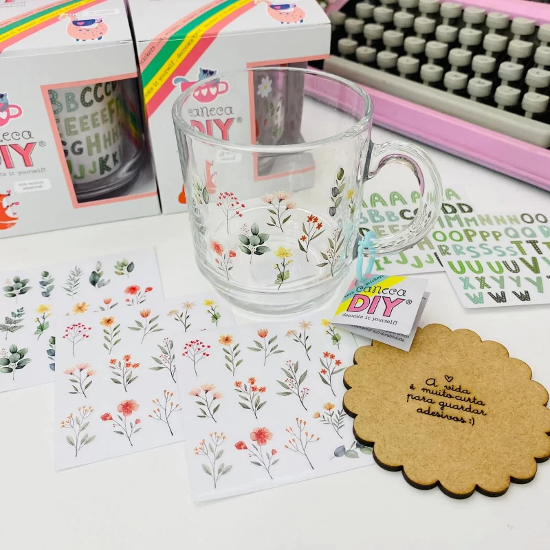 -1 Caneca de vidro lisa, 350 ML -3 Cartelas de adesivos resistentes à água com desenhos temáticos -2 Cartelas com letrinha para personalizar nome e frases -1 Suporte em MDF com a frase: “A vida é muito curta para guardar adesivos”.
