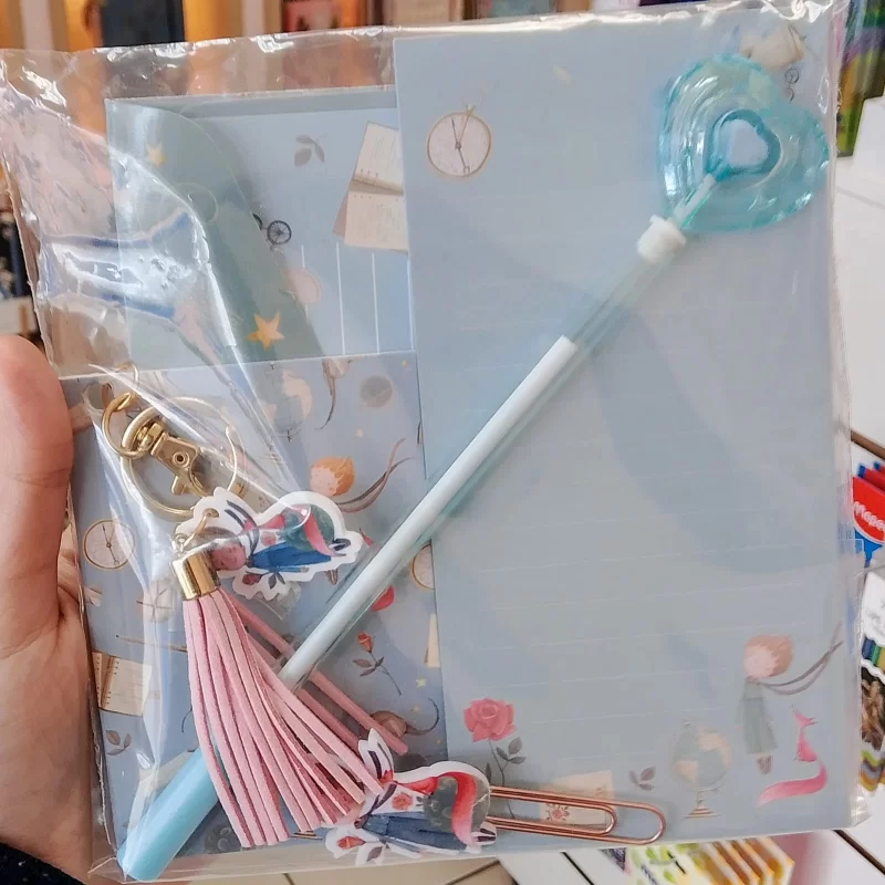 Esse kit contém 1 papel de carta, 1 bloquinho de notas, 1 chaveiro caderninho, 1 clip, 1 caneta, tudo do pequeno príncipe